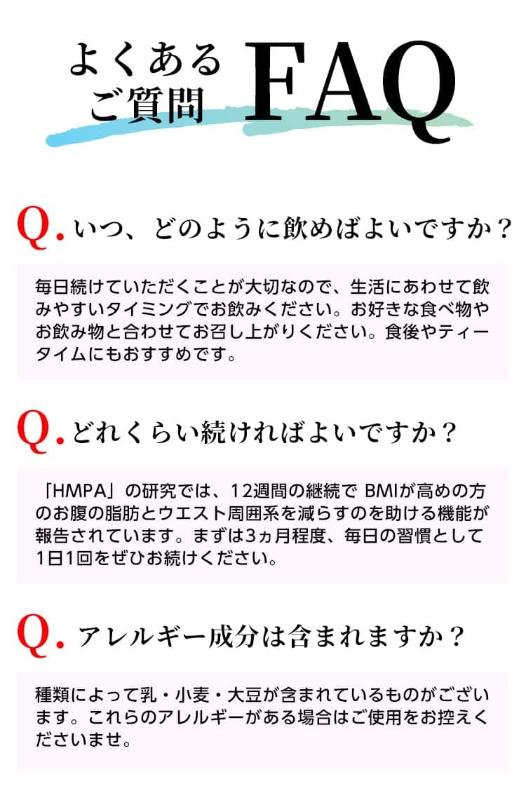 本品には3-(4-ヒドロキシ-3-メトキシフェニル)プロピオン酸 (HMPA)が含まれます。HMPAは、BMIが高めの方の腹部の脂肪(内臓脂肪)とウエスト周囲径を減らす機能、食後血糖値が高めの方の食後に上昇した血糖値を下げる機能が報告されています。