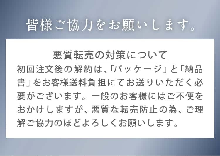 - 初回のみで解約される場合は、転売防止の為、納品書と外箱の返送(送料お客様負担/10日以内必着)が必要です。詳細は特定商取引法表示をご確認ください。